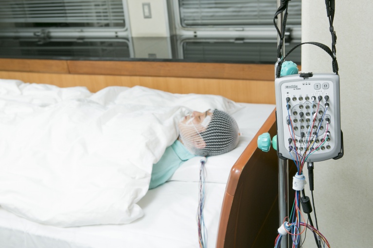 電極を体に取り付け、脳波の動きや目の動き、呼吸、酸素濃度などを検査します。8時間ポリグラフで検査・診断します。学会認定の検査技師が、遠隔で終夜観察します。翌朝はそのまま帰宅が可能です。